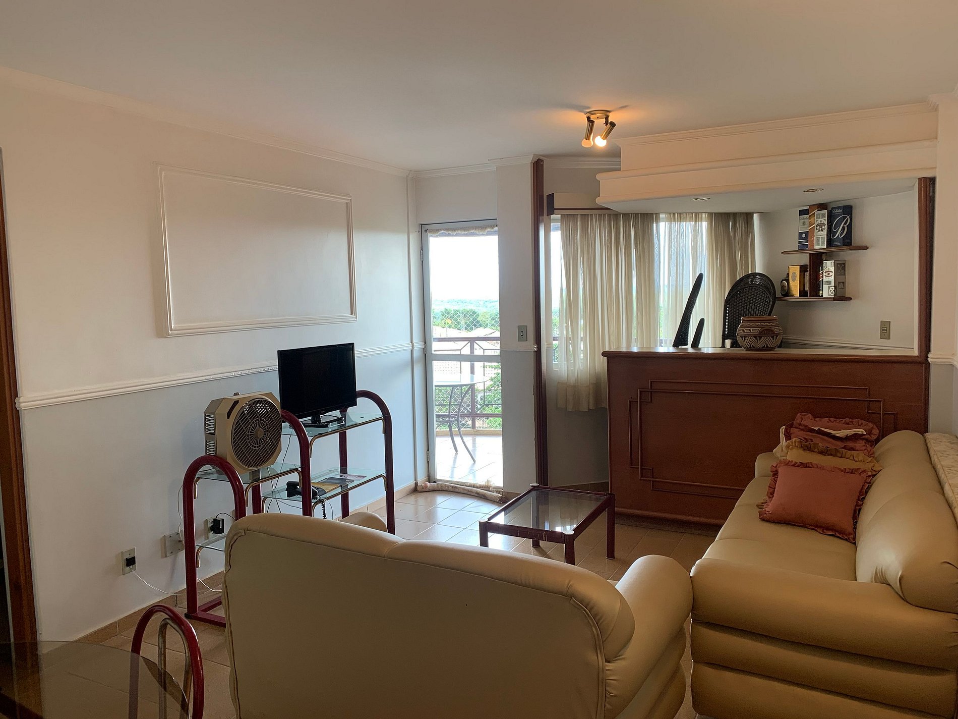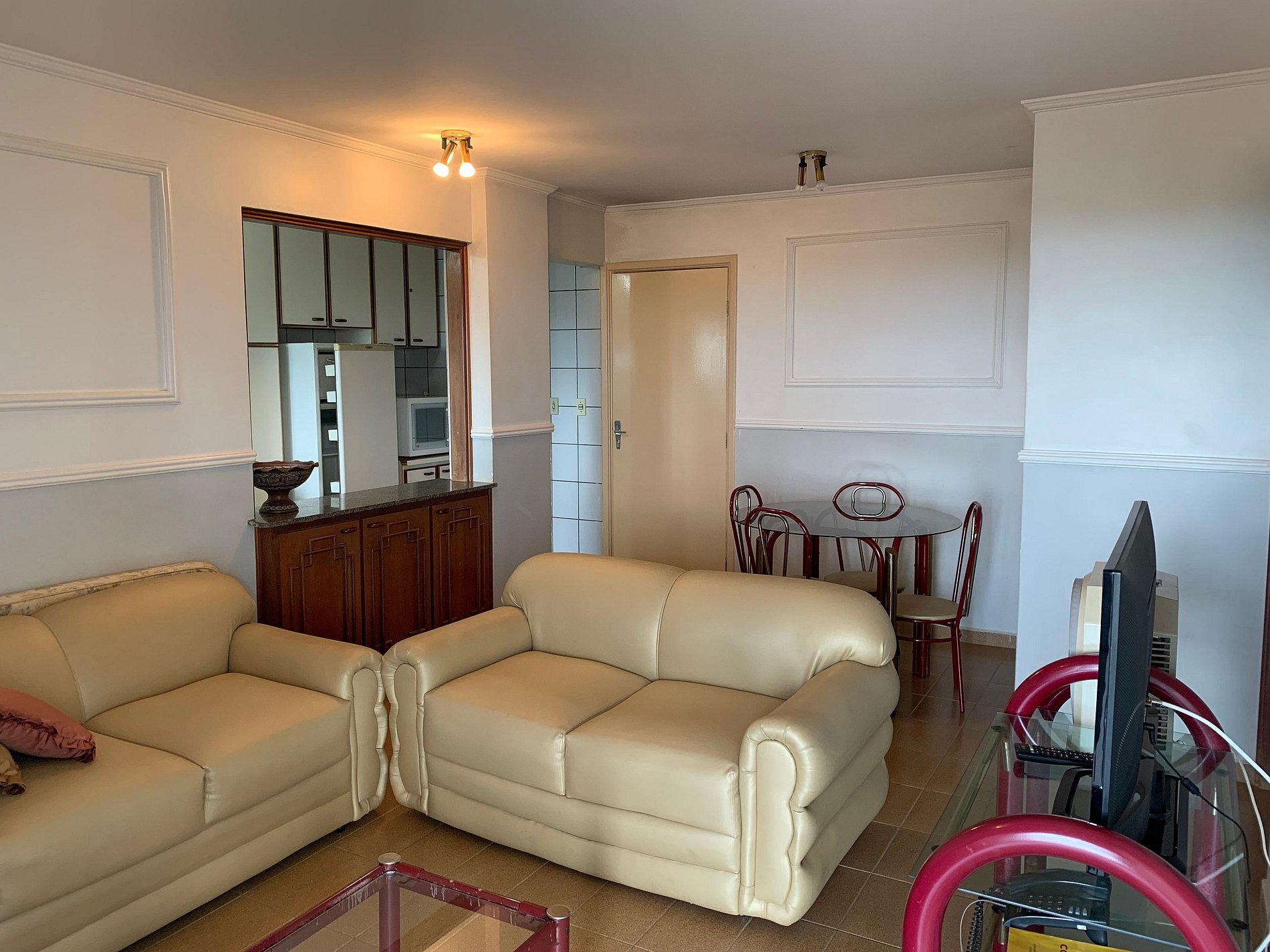 *Sala com sofá cama de casal, TV, varanda vista para as piscinas, cozinha completa com geladeira, microondas, fogão e utensílios de cozinha.