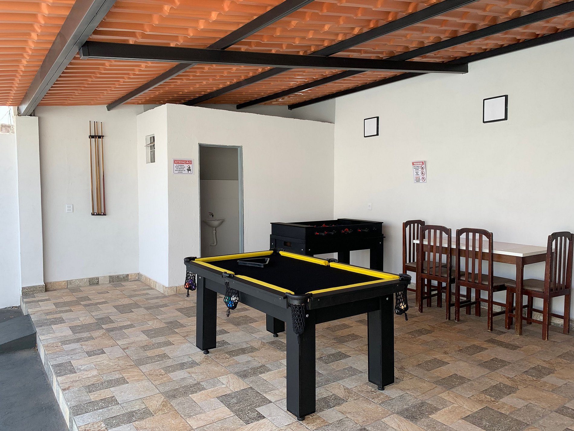 Área de lazer com piscina aquecida, churrasqueira, mesa de sinuca, pebolim, mesa com guarda sol.