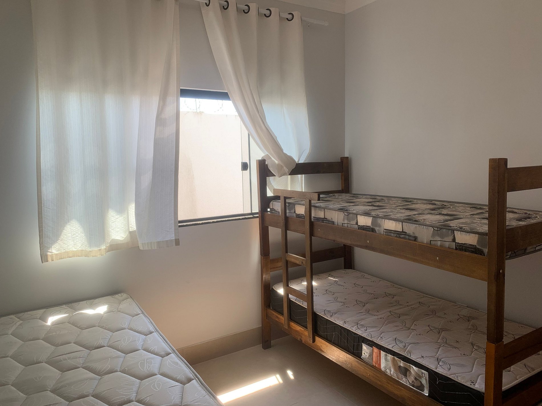 Quarto de solteiro com beliche e 01 cama de solteiro.