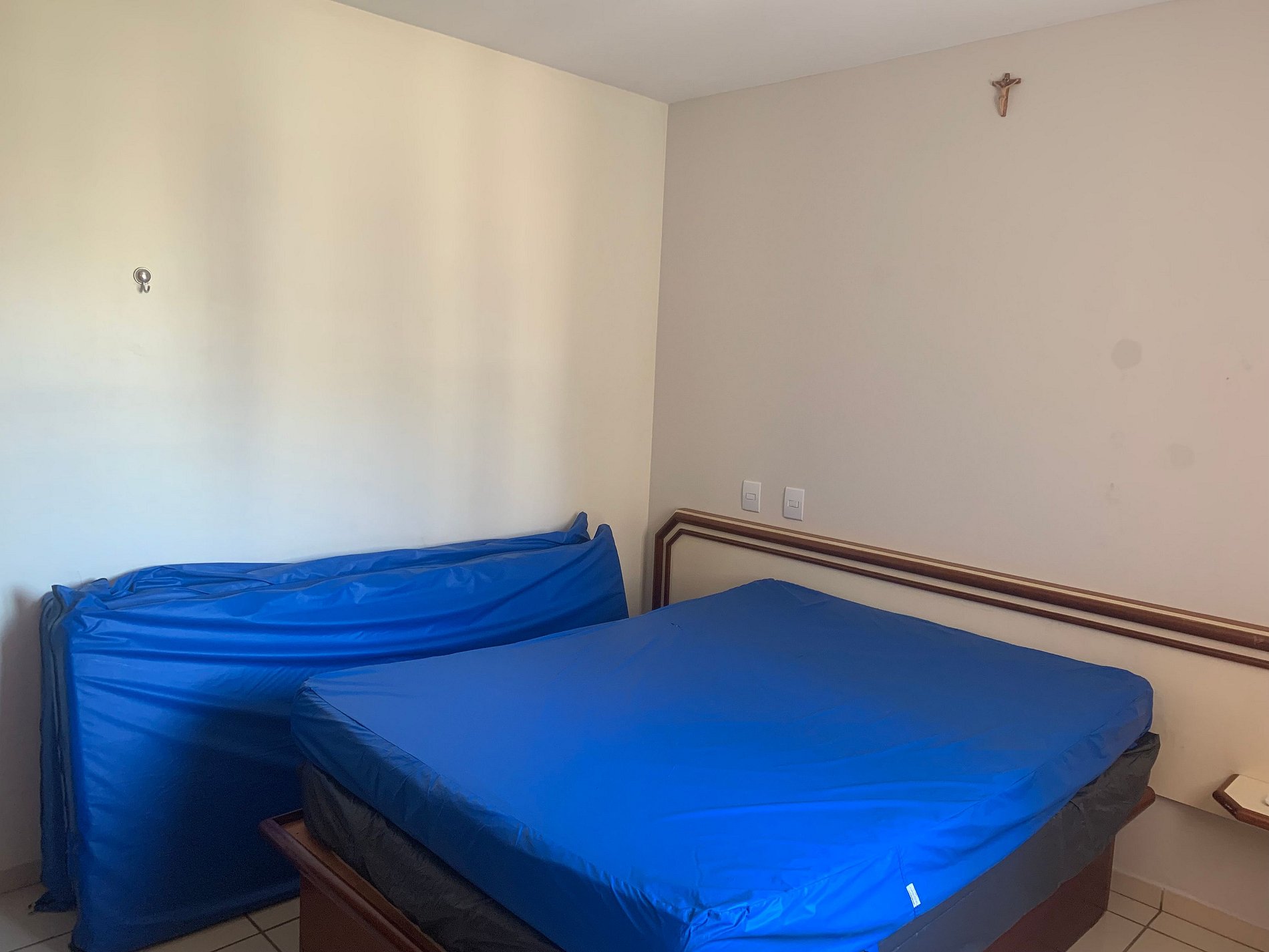 QUARTO com: 01 cama de casal, 01 colchão de solteiro, ar condicionado e guarda-roupa.