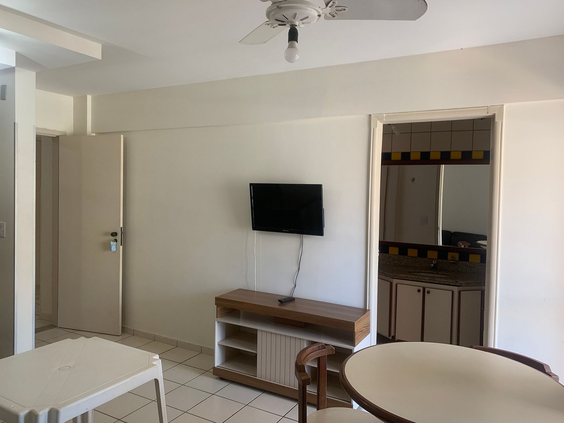 SALA com: sofá cama casal, ventilador, TV, sacada com tela de proteção,