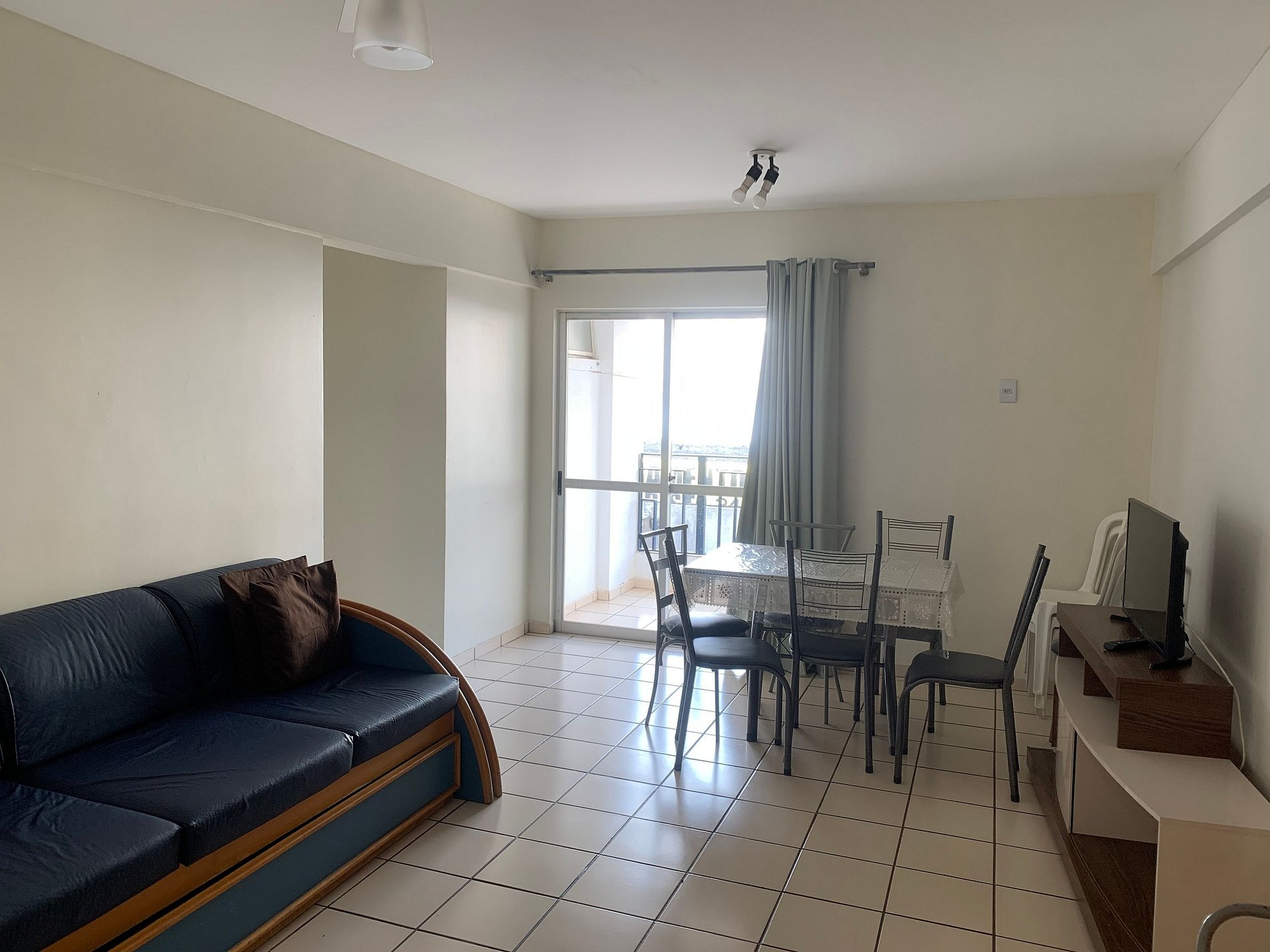 SALA com: sofá cama, TV, sacada com tela de proteção,