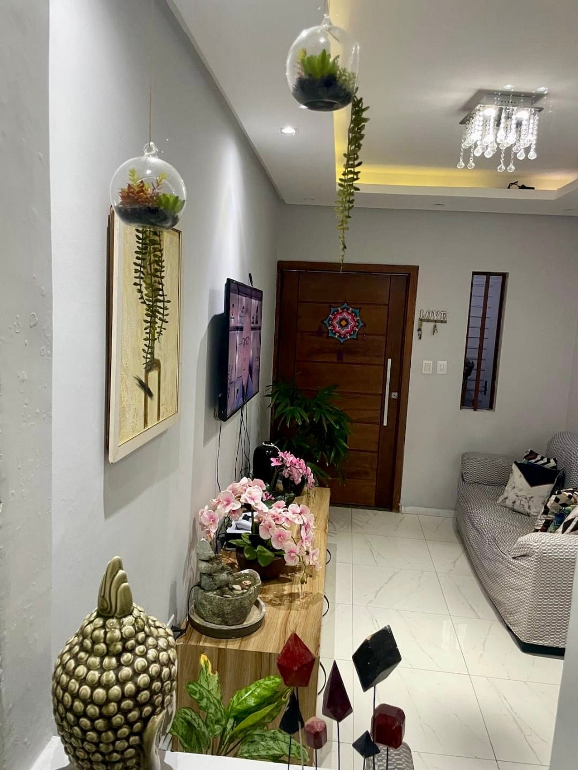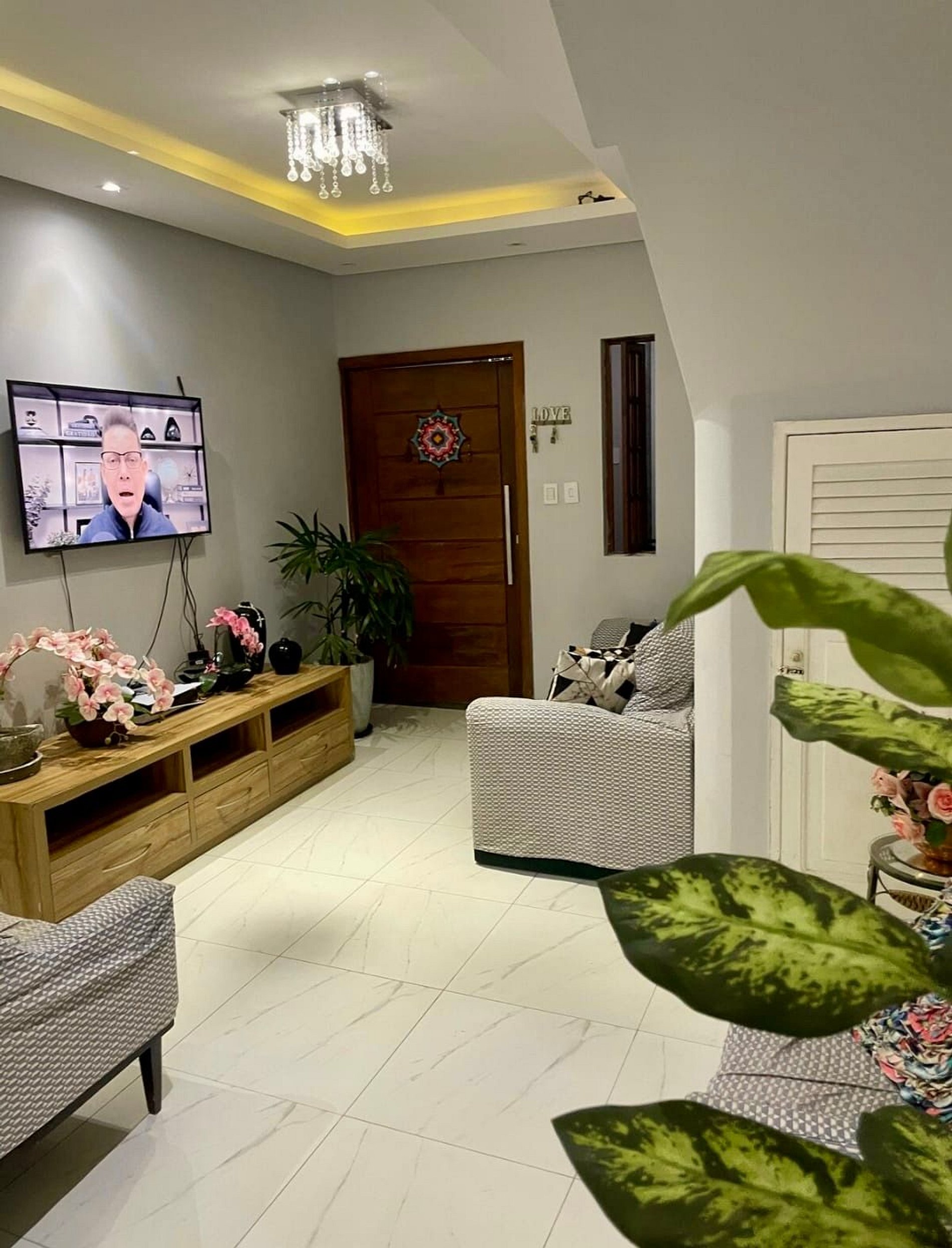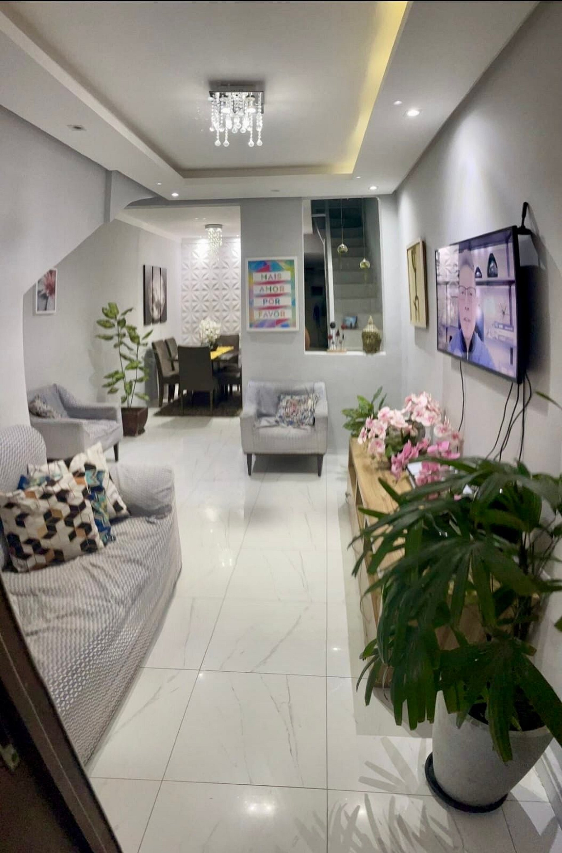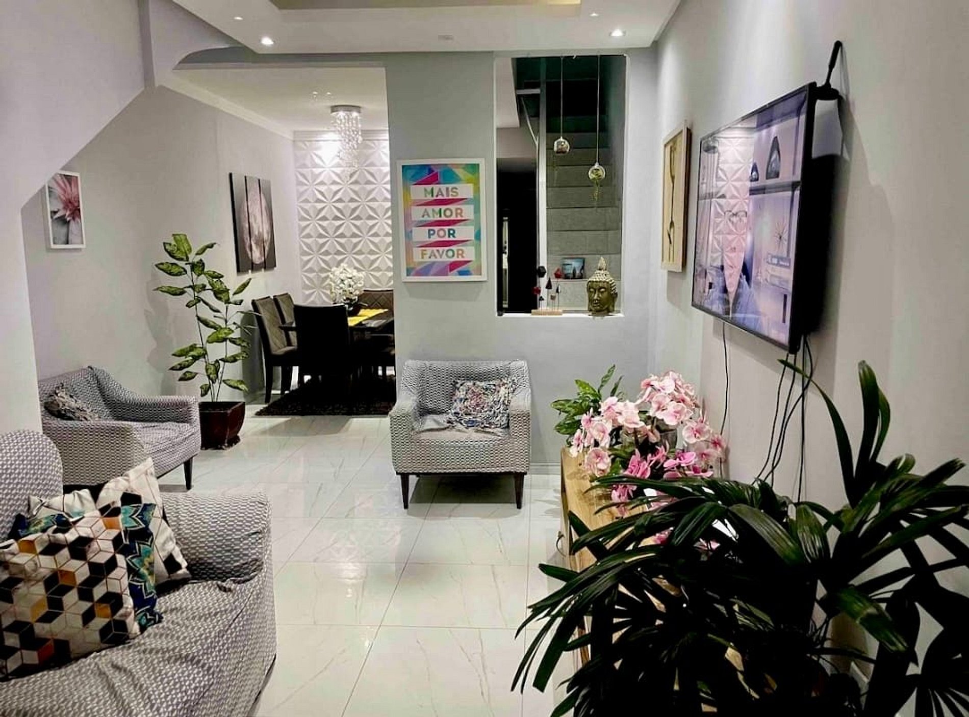 Sala ampla e arejada, com sofá, TV e ambiente perfeito para descansar após um dia de passeio