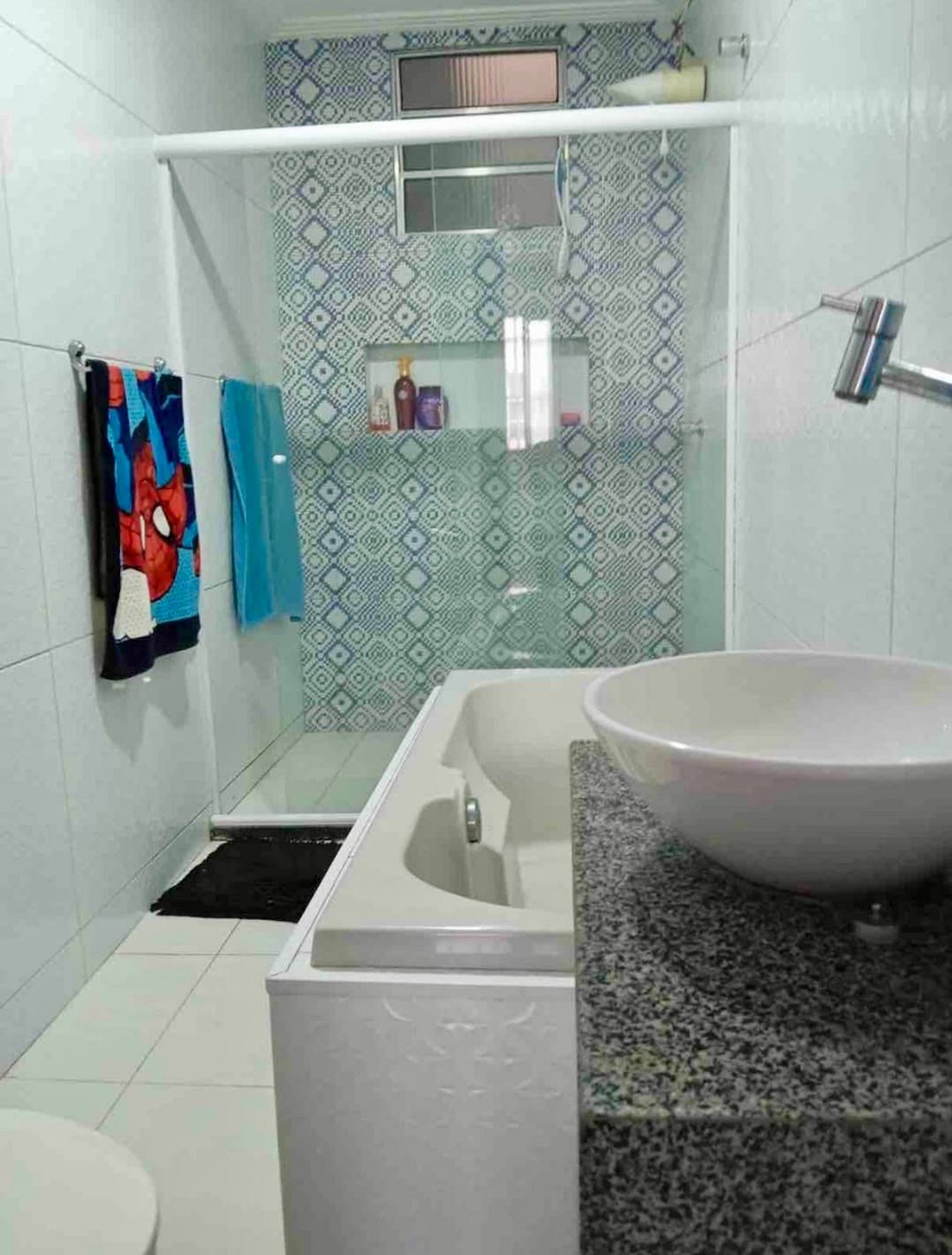 Banheiro com chuveiro elétrico, toalhas